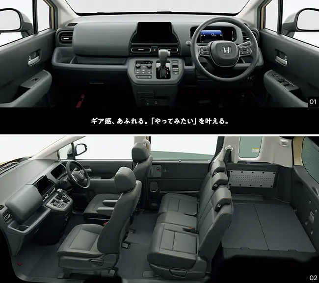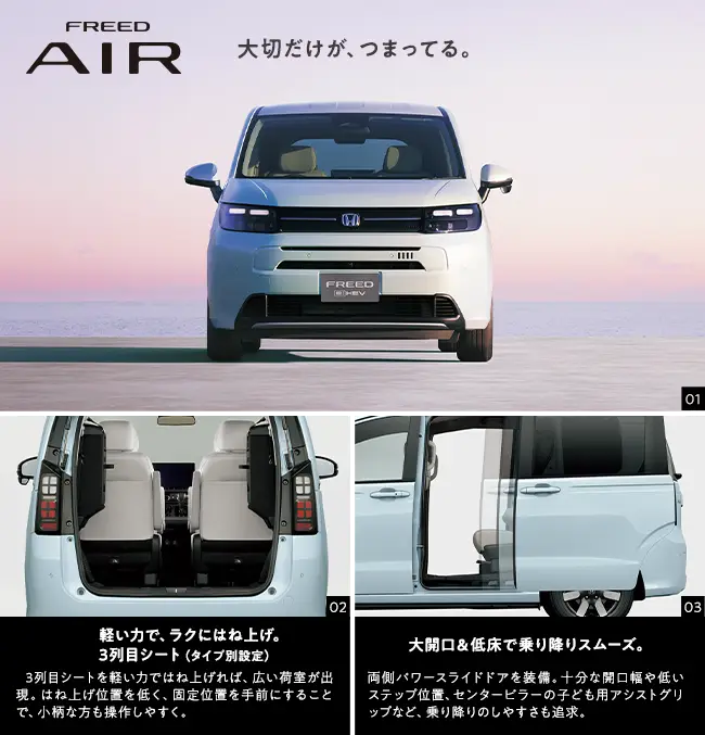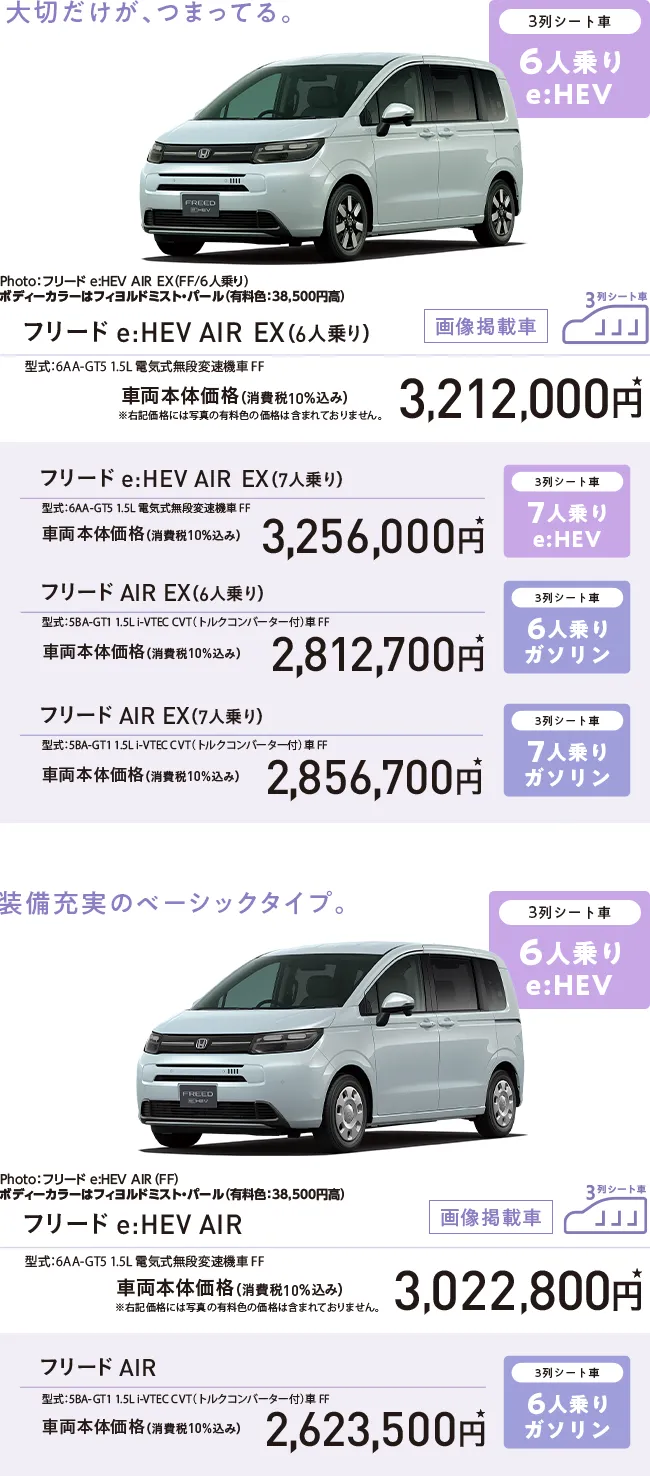 Photo01・02・03:フリード e:HEV AIR EX(FF/6人乗り) 車両本体価格(消費税10%込み)3,212,000円★ 価格には写真の有料色及びメーカーオプション・ディーラーオプションの価格は含まれておりません。 ボディーカラーはフィヨルドミスト・パール(有料色:38,500円高) メーカーオプション(マルチビューカメラシステム+LEDアクティブコーナリングライト、アダプティブドライビングビーム、後退出庫サポート:119,900円高)、ディーラーオプション(11.4インチ Honda CONNECTナビ LXM-247VFLi〈取付アタッチメント含む〉:320,100円〈取付工賃別途〉)装着車 Photo02:インテリアカラーはグレージュ ■シートアレンジの各操作は、異物をはさんでいないか確認の上、無理な力をかけず確実に行ってください。 Photo03:インテリアカラーはグレージュ ■機能説明のためのイメージ。