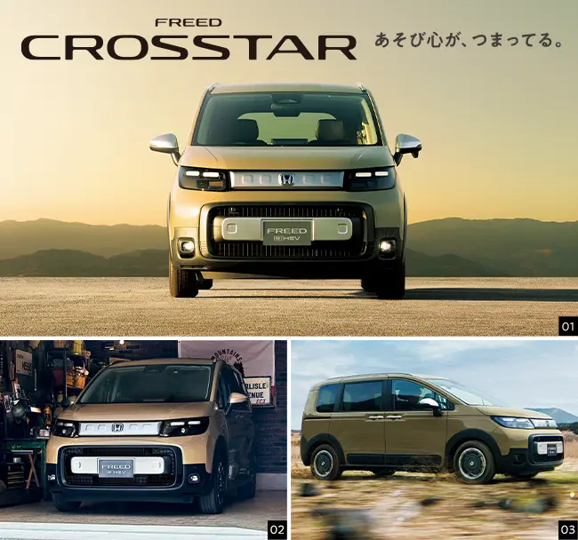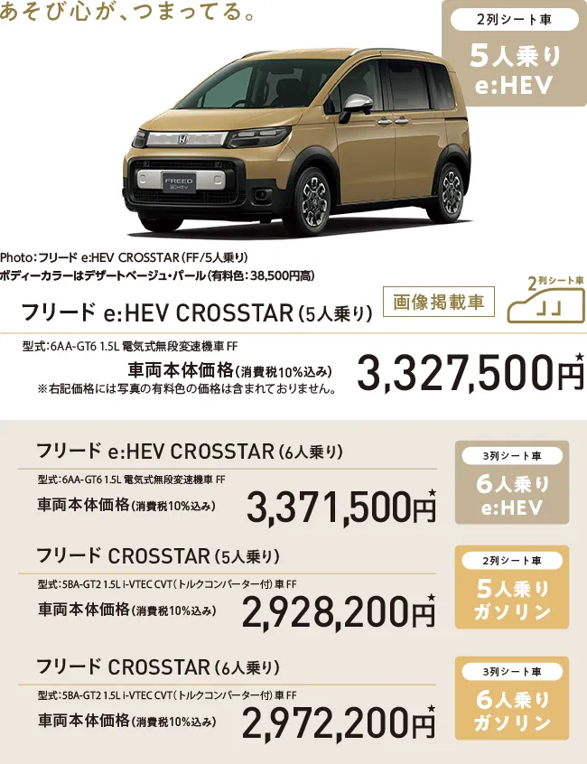 Photo01・02:フリード e:HEV CROSSTAR(FF/5人乗り) 車両本体価格(消費税10%込み)3,327,500円★ 価格には写真の有料色及びディーラーオプションの価格は含まれておりません。 ボディーカラーはデザートベージュ・パール(有料色:38,500円高) ディーラーオプション(11.4インチ Honda CONNECTナビ LXM-247VFLi〈取付アタッチメント含む〉:320,100円〈取付工賃別途〉)装着車 Photo03:フリード e:HEV CROSSTAR(FF/5人乗り) 車両本体価格(消費税10%込み)3,327,500円★ 価格には写真の有料色及びディーラーオプションの価格は含まれておりません。 ボディーカラーはデザートベージュ・パール(有料色:38,500円高) ディーラーオプション(11.4インチ Honda CONNECTナビ LXM-247VFLi〈取付アタッチメント含む〉:320,100円、ボディーサイドモール:33,000円〈すべて取付工賃別途〉)装着車