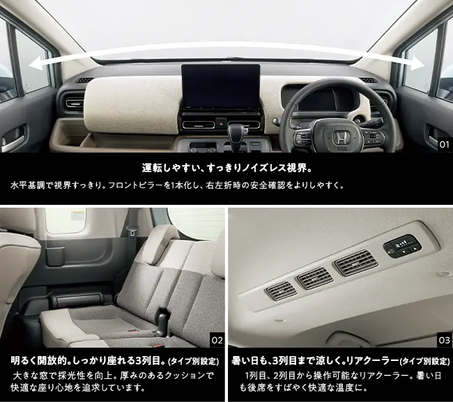 Photo01・02・03:フリード e:HEV AIR EX(FF/6人乗り) 車両本体価格(消費税10%込み)3,212,000円★ 価格には写真のメーカーオプション及びディーラーオプションの価格は含まれておりません。ボディーカラーはフィヨルドミスト・パール(有料色:38,500円高) インテリアカラーはグレージュ Photo01:メーカーオプション(マルチビューカメラシステム+LEDアクティブコーナリングライト、アダプティブドライビングビーム、後退出庫サポート:119,900円高)、ディーラーオプション(11.4インチ Honda CONNECTナビ LXM-247VFLi〈取付アタッチメント含む〉:320,100円〈取付工賃別途〉)装着車 ■機能説明のためのイメージ。