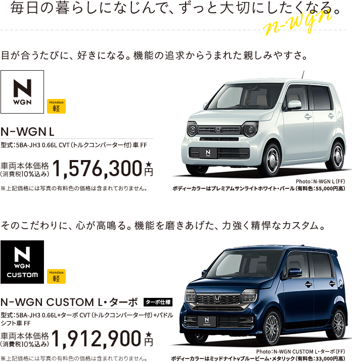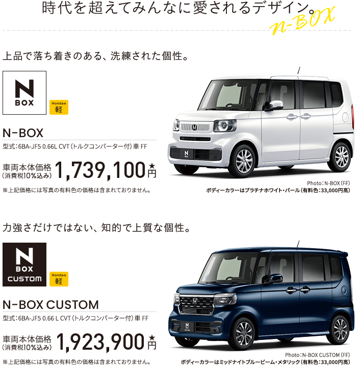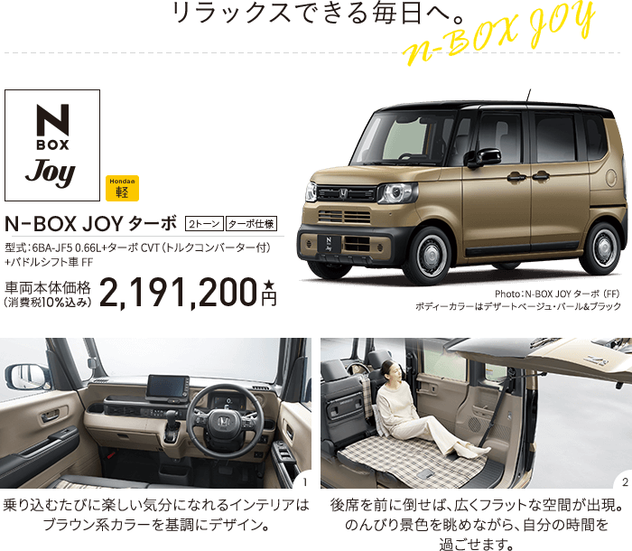 Photo:[1]N-BOX JOY ターボ(FF) 車両本体価格(消費税10%込み)2,191,200円★ 価格には写真のメーカーオプション及びディーラーオプションの価格は含まれておりません。 ボディーカラーはデザートベージュ・パール&ブラック メーカーオプション(マルチビューカメラシステム:72,600円高)、ディーラーオプション(N-BOX専用 9インチ Honda CONNECTナビ LXU-242NBi〈取付アタッチメント、パネルキット含む〉:259,600円〈取付工賃別途〉)装着車 ■メーター類は撮影のため点灯。 ■画面はハメコミ合成。[2]N-BOX JOY ターボ(FF) 車両本体価格(消費税10%込み)2,191,200円★ 価格には写真のメーカーオプション及びディーラーオプションの価格は含まれておりません。 ボディーカラーはデザートベージュ・パール&ブラック メーカーオプション(マルチビューカメラシステム:72,600円高)、ディーラーオプション(N-BOX専用 9インチ Honda CONNECTナビ LXU-242NBi〈取付アタッチメント、パネルキット含む〉:259,600円〈取付工賃別途〉)装着車 ■写真は機能説明のためのカットボディーによる合成写真。 ■小物類は撮影のために用意したものです。 ■写真は停車中のイメージです。 ■シートアレンジの各操作は、異物を挟んでいないか確認の上、無理な力をかけず確実に行ってください。