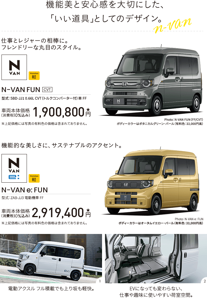 Photo:[1]N-VAN e: L4 車両本体価格(消費税10%込み)2,699,400円★ 価格には写真のメーカーオプション及びディーラーオプションの価格は含まれておりません。 ボディーカラーはタフタホワイトIII メーカーオプション(急速充電ポート[外部給電機能付〈高出力対応〉]+急速充電リッドオープンスイッチ:110,000円高)、ディーラーオプション(デカール EV:18,040円、ウインドウプロテクションバー:15,400円〈すべて取付工賃別途〉)装着車[2]Photo:N-VAN e: L4 車両本体価格(消費税10%込み)2,699,400円★ 価格には写真のディーラーオプションの価格は含まれておりません。 ボディーカラーはタフタホワイトIII ディーラーオプション(8インチ Honda CONNECTナビ VXM-245ZFEi〈取付アタッチメント、GNSSアンテナ含む〉:160,600円〈取付工賃別途〉)装着車 ■シートアレンジの各操作は、異物をはさんでいないか確認の上、無理な力をかけず確実に行ってください。