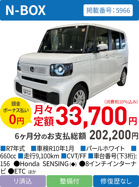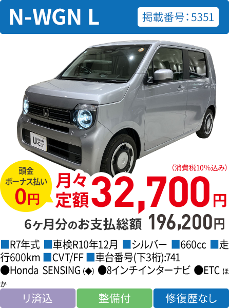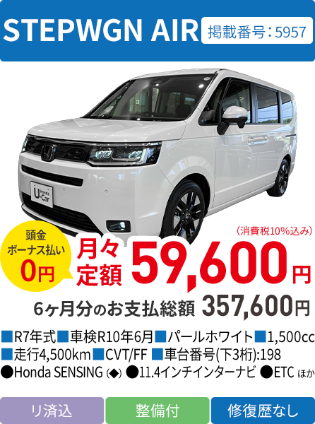 本リースは賃貸です。リース期間終了後は車両をご返却いただきます。リース料金には、車両価格/登録諸費用/自動車税環境性能割/期間中の自動車税種別割/登録時の重量税・自賠責保険料が含まれております。別途、一般車両保険を含む任意保険へのご加入が必要です。ご契約にあたっては、 株式会社ホンダファイナンスまたは株式会社ジャックスの審査が必要となります。 審査の内容によってはご利用いただけない場合がございます。リース契約は原則途中解約できません。中途解約金の発生等については営業スタッフへお問い合わせください。