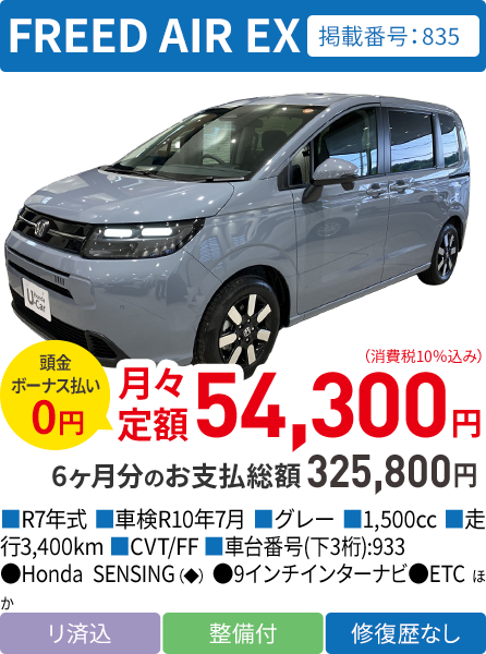 ※初回のお支払いは、登録翌々月に2回分をお支払いいただきます。※車両返却の際、車両状態、走行距離等が別途定める基準を超える場合は別途精算が必要となります。リース期間終了時の条件等については 営業スタッフへお問い合わせください。※リース料金はあくまで一例です。※詳しくは営業スタッフへお問い合わせください。